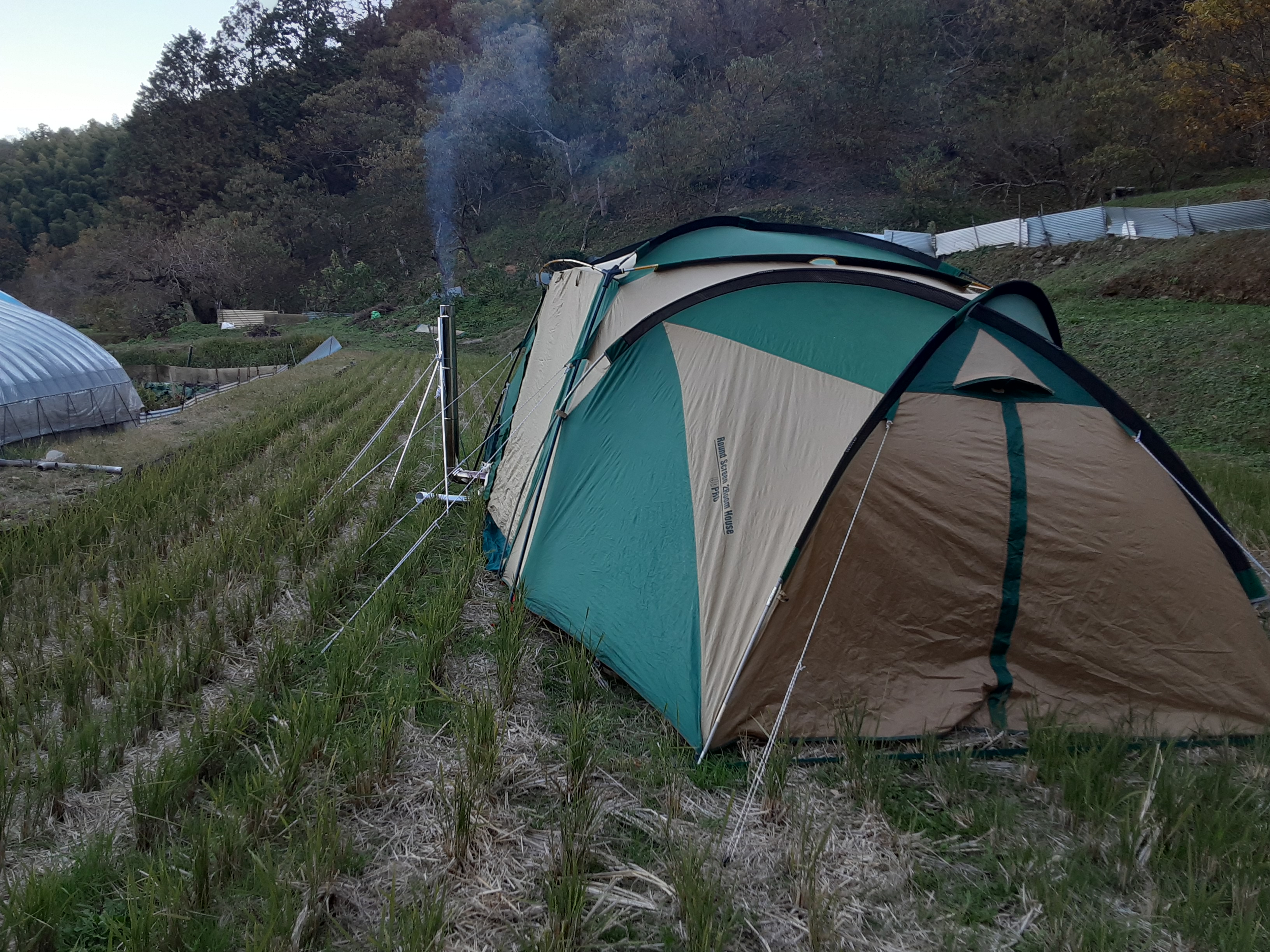 今回からはテント中央から煙突を